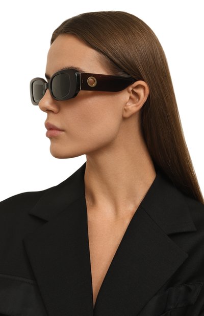 Овальные солнцезащитные очки из ацетата черепаховой расцветки вошли в линию HardWear. Аксессуар с шарнирами в форме фирменных звеньев оснастили затемненными линзами, на 100% блокирующими UVA- и UVB-лучи.