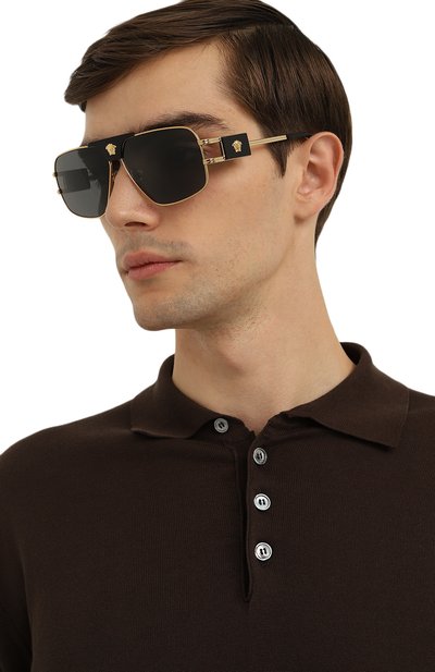 Безободковые авиаторы из металла украсили рельефным меандровым узором и выгравированным логотипом на дужках. Аксессуар оснастили дымчатыми линзами со 100% защитой от ультрафиолета.