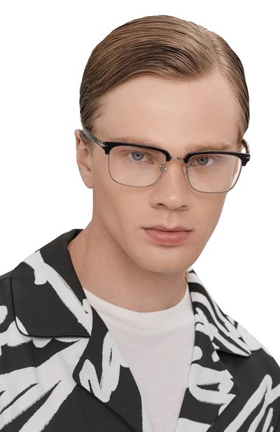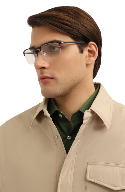 Полуободковую оправу с возможностью выбора линз двух размеров выполнили из металла. Широкие дужки с гибкими шарнирами и тисненой полосой украсили логотипом.