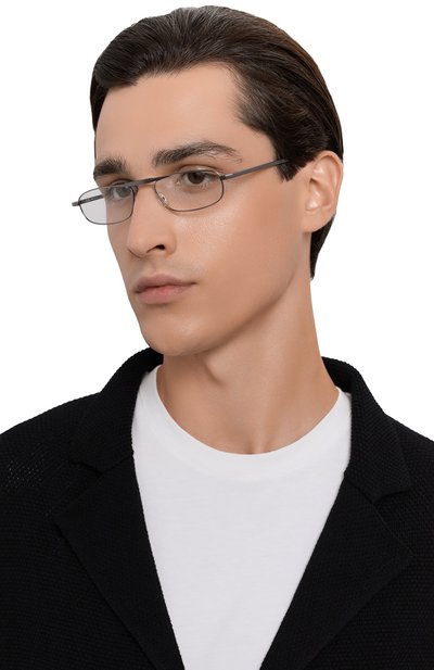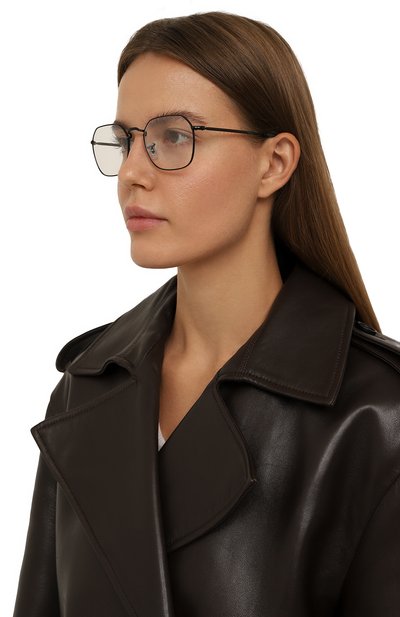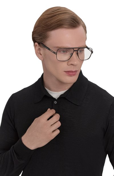 Оправу с многоугольными ободами выполнили из металла с покрытием Dark Ruthenium. Аксессуар с заушниками черепаховой расцветки украсили выгравированным логотипом на плоских дужках.