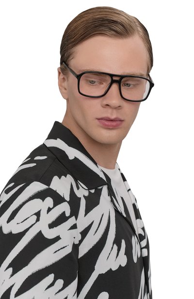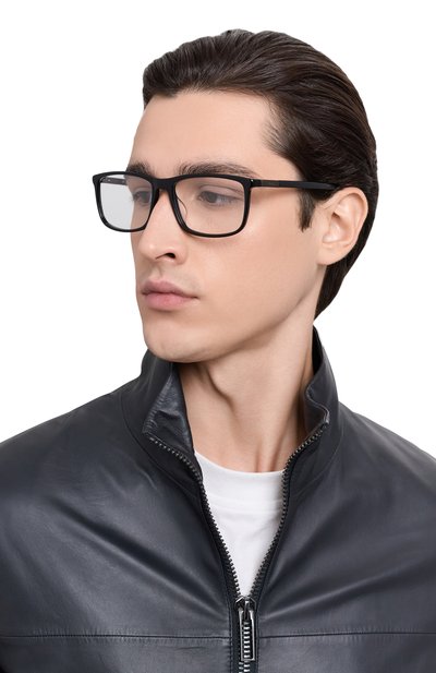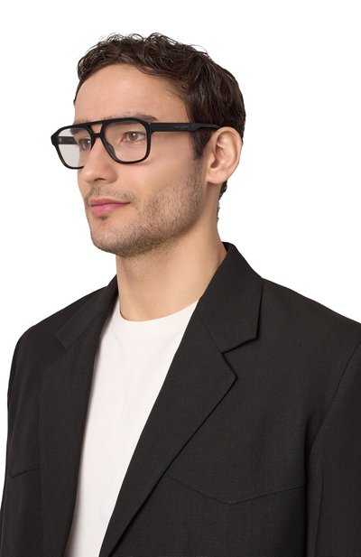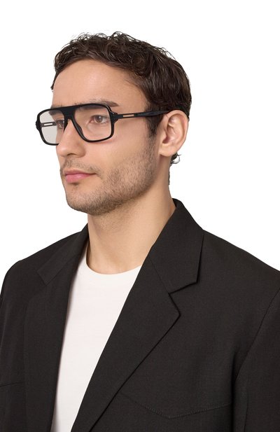 Оправу Marc 845 украсили полосами и логотипом на широких фигурных дужках. Аксессуар с акцентированным двойным мостом выполнили из ацетата.