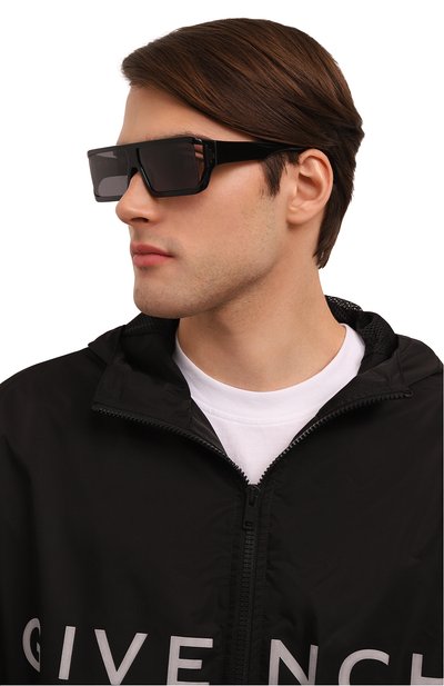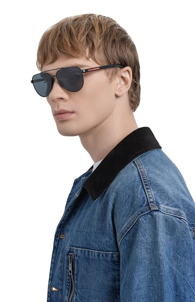 Авиаторы из ацетата дополнили полупрозрачными поляризованными линзами. Дужки аксессуар украсили алой вставкой с логотипом линии Prada Linea Rossa.