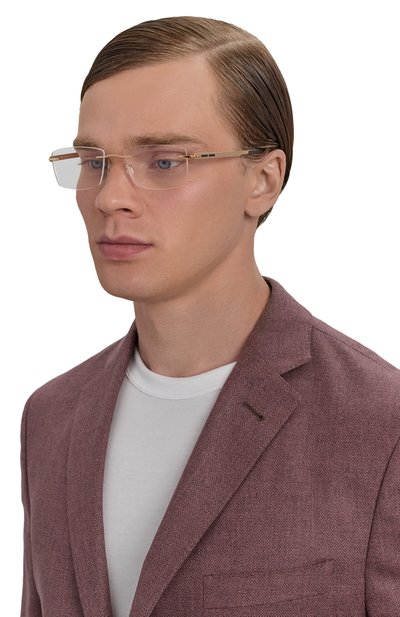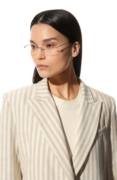 Безободковая оправа The Dawn с демо-линзами изготовлена из титана с финишем цвета розового золота. Аксессуар с безвинтовой конструкцией дополне н фирменными заушниками из полимера SPX®+.