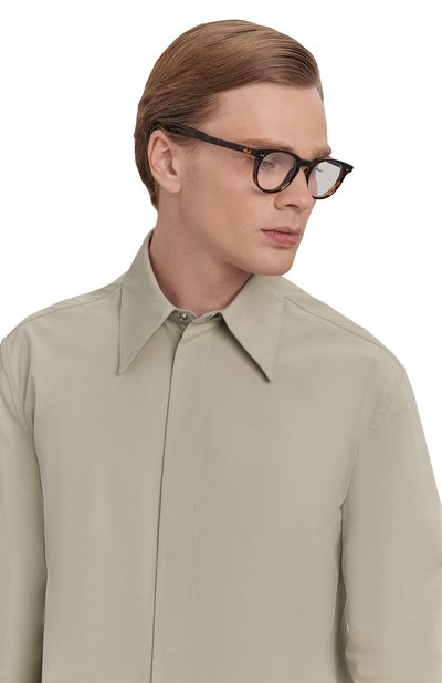 Оправу с прямоугольными демонстрационными линзами выполнили из ацетата с черепаховым узором. На дужках сформировали грань в виде фирменного треугольника с золотистым логотипом.