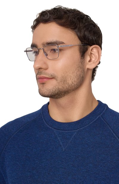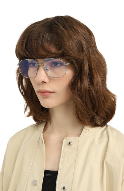 Тонкую овальную оправу из металла дополнили заушниками из глянцевого ацетата. О принадлежности аксессуара бренду рассказали логотипом, выгравированным на дужках.