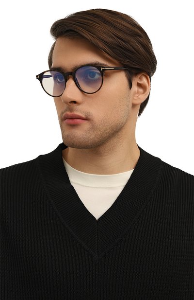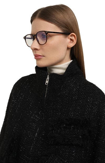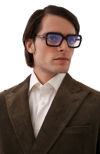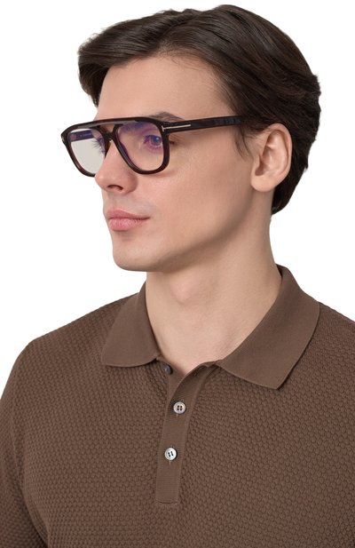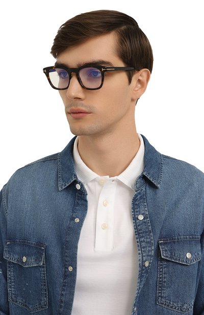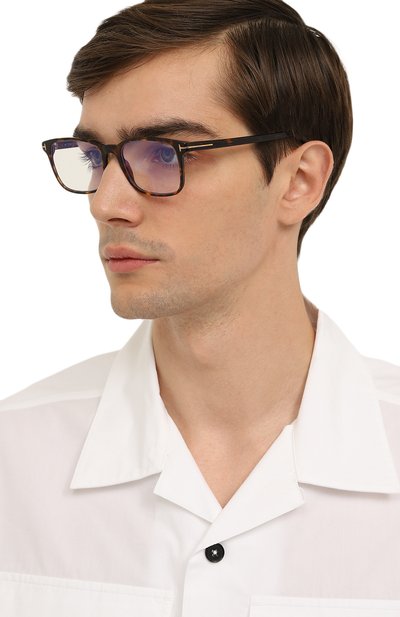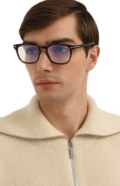 Прямоугольную оправу с фирменными литерами Т на рамке и широких дужках выполнили из черепахового ацетата. Аксессуар дополнен прозрачными линзами с покрытием blue block, блокирующим сине-голубое излучение от гаджетов.