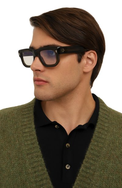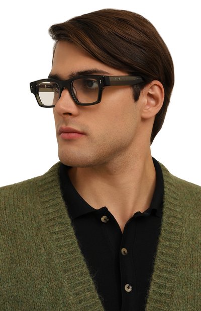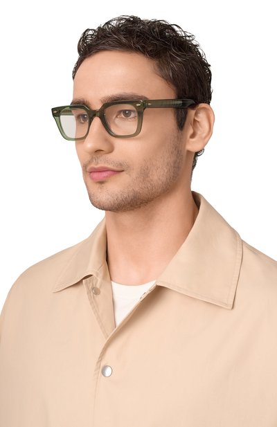 Прямоугольную оправу с брендированными деталями на дужках изготовили из полупрозрачного ацетата. Аксессуар дополнили линзами с покрытием blue block.