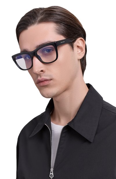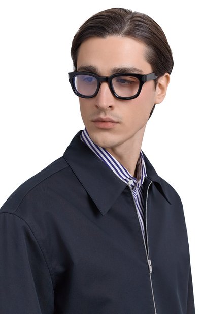 Оправу с литыми носоупорами и прямоугольными демонстрационными линзами выполнили из ацетата. Сбоку разместили контрастные металлические вставки, а на дужках выгравировали логотип.