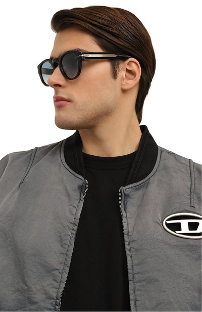 Солнцезащитные очки с двойным мостом выполнили из ацетата. Дужки модели и одну из градиентных линз украсили логотипом бренда, которому вторит эмблема на внутренней стороне левого заушника.