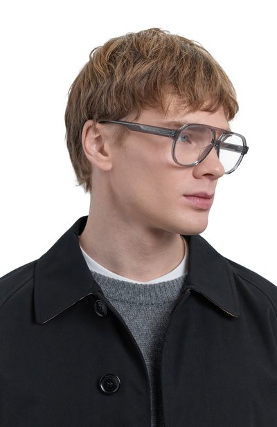 Оправу с двойным мостом и литыми носоупорами выполнили из полупрозрачного ацетата. Одну из армированных дужек модели украсили логотипом бренда.