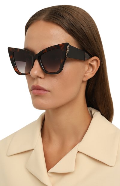 Солнцезащитные очки оснастили градиентными линзами, которые на 100% блокируют UVA- и UVB-лучи. Модель из ацетата оттенка Havana украсили логотипом и заклепками на широких дужках.