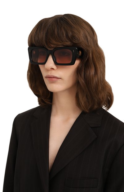 Солнцезащитные очки изготовили из легкого ацетата. Узкие дужки украсили золотистыми логотипами марки. Аксессуар дополнили поликарбонатными линзами со 100% УФ-фильтром.