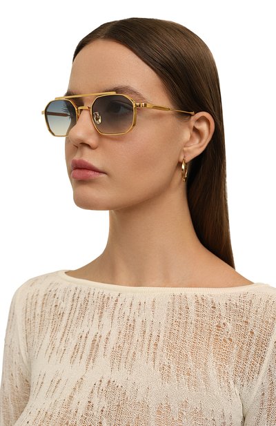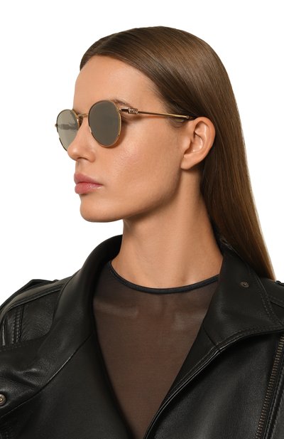Солнцезащитные очки из металла с золотистым финишем дополнили линзами со 100% УФ-фильтром. Дужки с заушниками из пятнистого ацетата украсили логотипами марки.