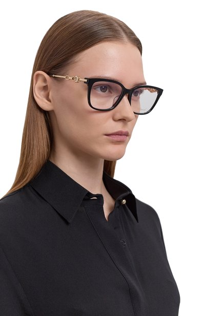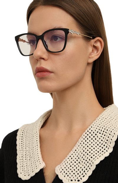 Рамку и брендированные заушники оправы формы cat eye выполнили из ацетата. Узкие дужки из золотистого металла украсили гравированным логотипом и орнаментом с миниатюрными кристаллами.