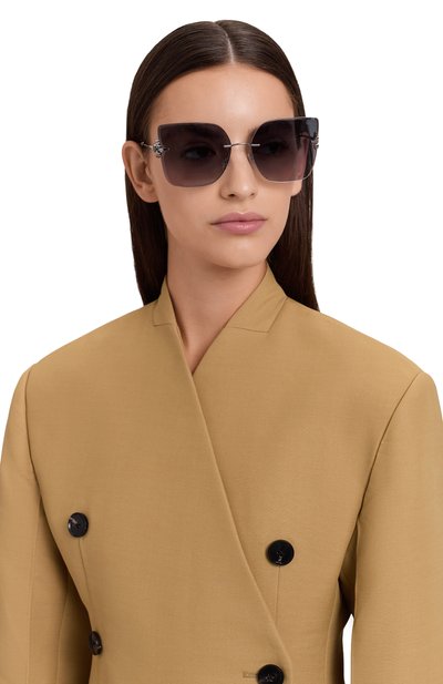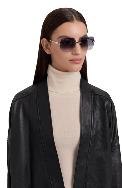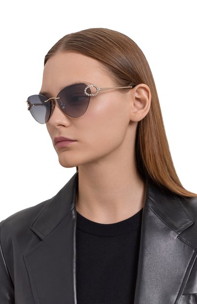 Безободковые солнцезащитные очки с градиентными линзами выполнили из металла. Фигурные крепления брендированных дужек подчеркнули кристаллами, а контрастные заушники дополнили вставками с логотипом марки.
