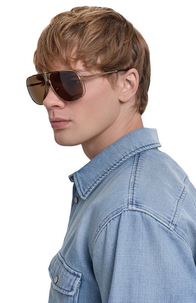 Безободковые солнцезащитные очки изготовили из ацетата черепаховой расцветки и металла. Вдохновленную автогонками лазерную гравировку на торцах затемненных линз повторили на креплениях дужек с брендированными накладками.