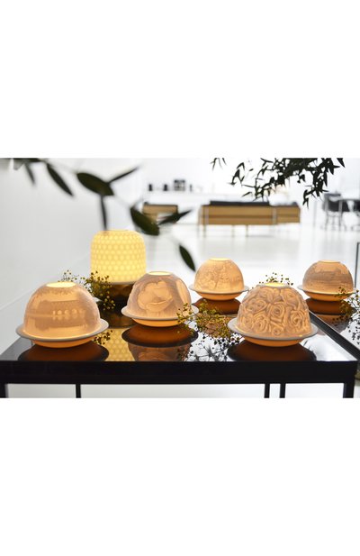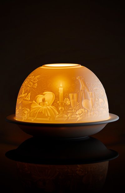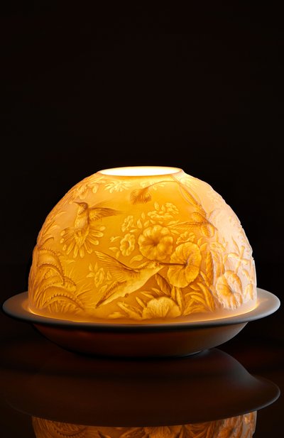 Путешествие в Париж может произойти в доли секунды — достаточно зажечь свечу в этом подсвечнике. Тепло пламени мягко подчеркивает изображение улицы вдоль Сены. Такой эффект создает тончайший бисквитный фарфор, на котором мастера мануфактуры вручную вырезали узор, в точности воспроизведя все детали пейзажа. Эту технику изготовления литофанов придумали в Лиможе в 1828 году.
