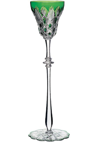 Фужеры для вина – точная копия изделий, произведенных на мануфактуре Baccarat для Императорского двора в 1909 году по эскизам Николая II. Чтобы подчеркнуть контраст изумрудно-зеленого и прозрачного хрусталя, использовали особую технику: верхний слой материала срезали вручную на гравировальном колесе. Нанесение тонкого рисунка, создающего непередаваемую игру света, требует от мастера долгих лет обучения и многих часов кропотливой работы.