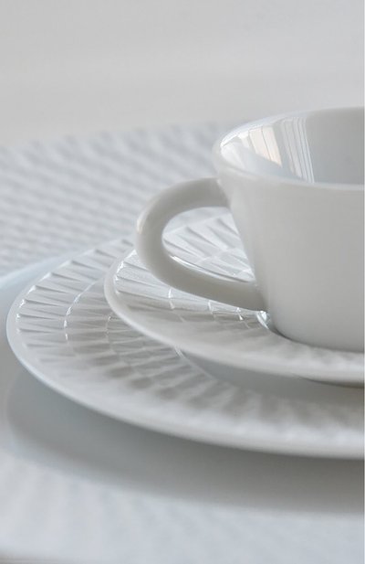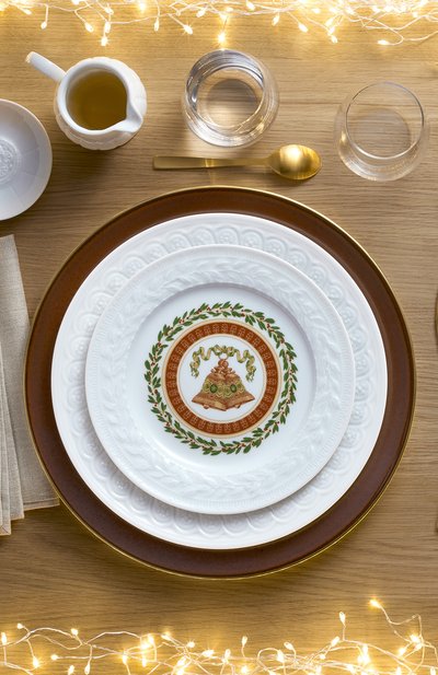 На создание коллекции Aux Oiseaux дизайнеров марки, основанной Леонардом Бернардо, вдохновила антикварная мебель XVI-XVII веков. Все предметы, включая и эту тарелку, декорировали росписью в виде сидящих на деревьях птиц и бабочек: рисунок напоминает традиционные японские гравюры, которыми украшали дверцы шкафов. Ремесленники мануфактуры бережно перенесли эскизы на белоснежный лиможский фарфор, а золотистые детали отполировали вручную уже после финального обжига.