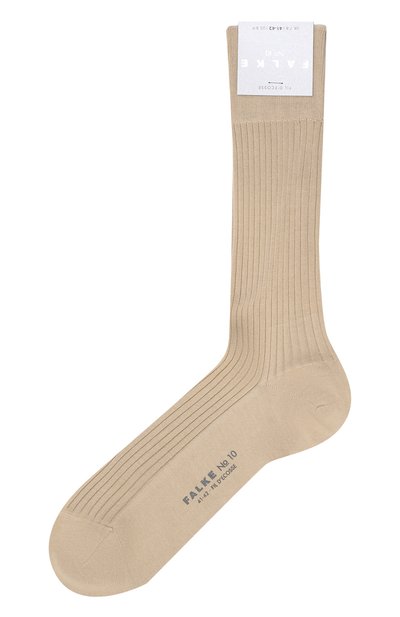Высокие бежевые носки связаны резинкой, поэтому плотно облегают ногу. При производстве однотонной модели мастера марки использовали гладкий хлопок фильдекос. Такая вещь прослужит долго: на поверхности этой прочной, туго скрученной нити не образуются катышки.