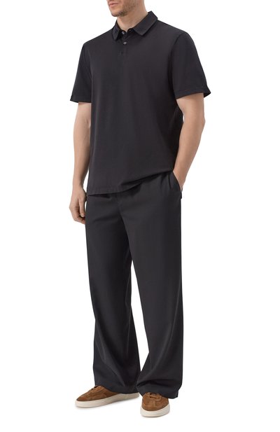 Поло выполнили из джерси на основе хлопка. Модель с небольшими боковыми разрезами окрасили неравномерно, придав изделию легкий эффект состаренности.