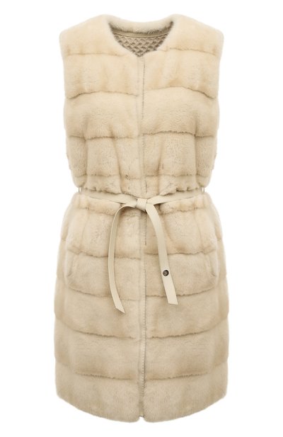 Бежевый жилет с круглой горловиной можно носить обеими сторонами наружу. Для пошива модели использовали шелковистый мех норки. Тщательно отобранные по цвету и густоте шкурки, искусно выделанные вручную, расположили так, чтобы получился горизонтальный полосатый узор. Обратную сторону с фактурным мотивом связали из тончайшего кашемира, который почти ничего не весит и хорошо согревает. Отделку и длинный пояс-ленту, формирующий приталенный силуэт, выполнили из матовой кожи.