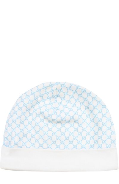 Для изготовления шапки с широким белым отворотом использован мягкий, не раздражающий кожу хлопок с голубым принтом-монограммой, составленным из инициалов Гуччио Гуччи.