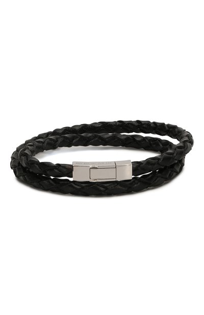 Черный браслет, который два раза оборачивается вокруг запястья, мастера бренда сплели из узких полос матовой зернистой кожи. Изделие дополнили крупной прямоугольной застежкой из полированного серебра 925 пробы. Такой аксессуар поддержит образ в стиле smart casual.