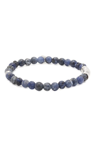 Узкий браслет сложен из содалитовых бусин разной огранки (их мастера марки обработали вручную), неоднородного синего оттенка: от ультрамаринового до почти черного. Эластичный аксессуар декорирован рядом небольших дисков из серебра 925 пробы, круглой деталью из него же и фирменным миниатюрным медальоном.