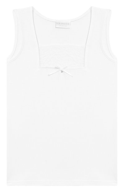 Облегающая белая майка с узкими лямками сшита из мягкого тонкого трикотажа с шелковистой текстурой. Квадратный вырез украшен ажурной кружевной вставкой в тон, а также миниатюрным бантом с позолоченной подвеской.