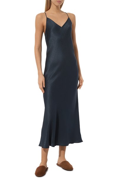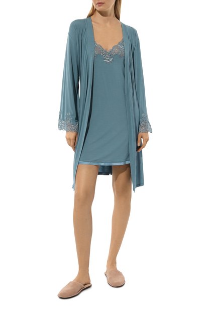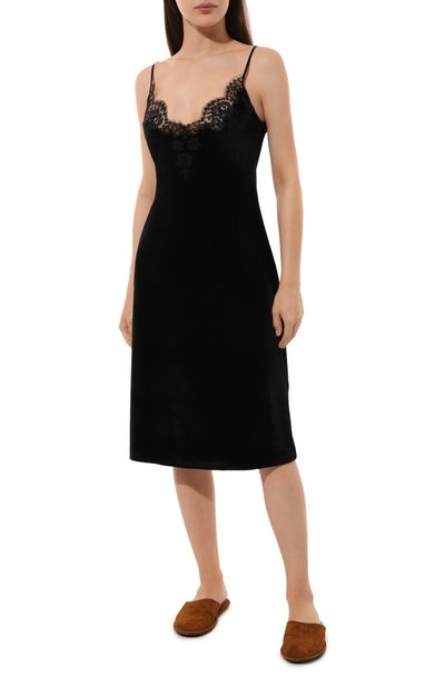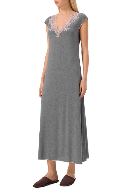 Для пошива сорочки с отрезным лифом и узкими регулируемыми бретелями использовали гладкий эластичный трикотаж на основе модала. Разрез спереди украсили ажурным кружевом Leavers.