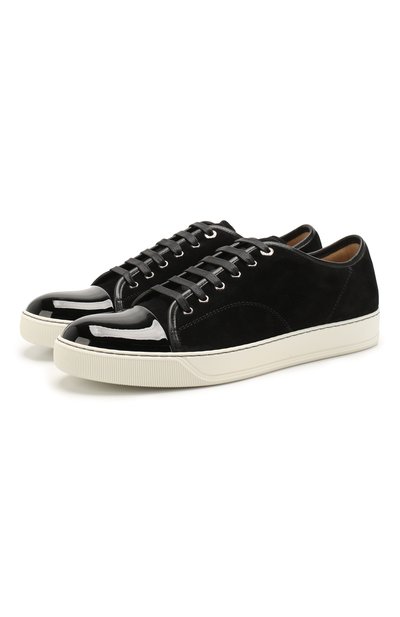 Черные кеды с гибкой белой подошвой вошли в классическую коллекцию марки, основанной Жанной Ланван. Модель из мягкой бархатистой замши дополнена лакированной вставкой на мысе. Вырез отделан гладкой кожей.
