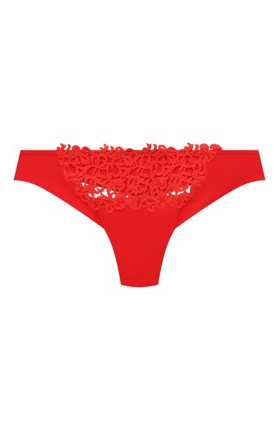 Красные трусы комфортно облегают тело, повторяя его контуры. Для пошива модели мастера марки использовали нежную шелковистую ткань, которая легко пропускает воздух. Спереди изделие декорировали вставкой из ажурного кружева макраме, сплетенного в знаковой для бренда технике frastaglio.