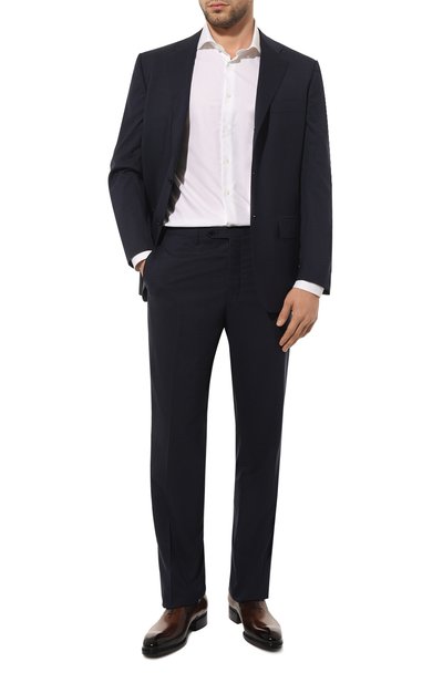 Легкая конструкция и мягкая ткань делают темно-синий костюм в крупную клетку эталоном итальянской портновской школы. Пиджак с широкими лацканами и прямые брюки со стрелками сшили из тонкой шерсти. Детали, выкроенные по проверенным временем лекалам, многократно отпарили, точно подогнали и соединили, используя ручные и машинные стежки, поэтому комплект идеально садится по фигуре и хорошо держит форму.