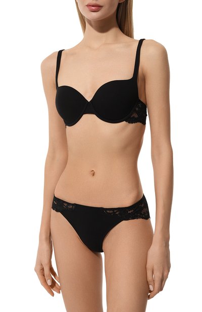 Черный бюстгальтер сшит из эластичного шелковистого джерси на основе мягкого хлопка. Плотные чашечки со встроенными косточками обеспечивают оптимальную поддержку груди. Широкий пояс украшен полупрозрачным кружевом Leavers с растительным мотивом. Оно соткано на старинных станках, имитирующих ручную работу.