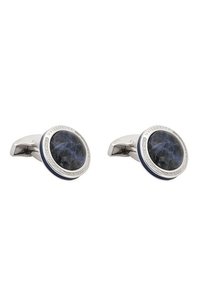Круглые ассиметричные запонки с застежкой Bullet Back мастера марки изготовили из легкого полированного серебра 925 пробы. Аксессуар дополнен вставкой из синего содалита с фактурной поверхностью и характерным для этого минерала светлым узором. Декор подчеркнут гильошированной гравировкой, эмалевым кантом в тон и логотипом бренда.