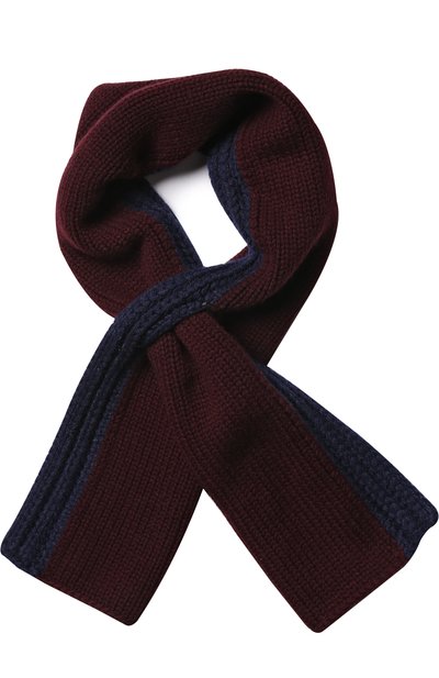 Для изготовления бордового шарфа с темно-синим краем мастера марки использовали тонкую кашемировую пряжу. Волокна для создания этого легкого прочного материала вычесываются вручную из подпушка коз породы Hircus. Модель можно носить разными способами: обернуть вокруг шеи или продеть один конец в специальную прорезь в другом.