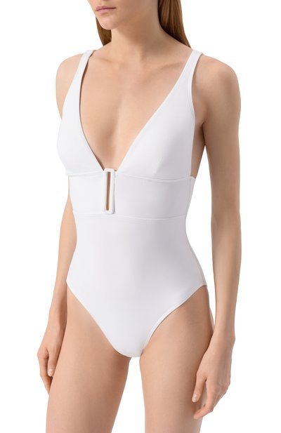 Белый купальник с глубокими вырезами декорировали корсетной шнуровкой и крупными волнистыми фестонами, выполненными вручную. Для пошива модели с широкими бретелями использовали мягкую микрофибру, которая быстро сохнет. Напоминающий по фактуре плетение материал хорошо тянется, но не теряет форму со временем.