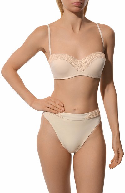 Белое бра с широкими бретелями выполнено мастерами марки из быстросохнущего эластичного текстиля. Материал хорошо тянется, поэтому вещь комфортно облегает фигуру. Изделие со шнуровкой декорировано знаковыми для бренда фестонами.
