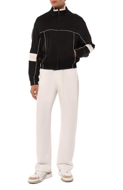 Для создания черного бомбера с отделкой из гладкой белой кожи дизайнер выбрал плотную шерстяную ткань (обычно из такого текстиля шьют классические пальто). Широкие манжеты, пояс и воротник-стойку мастера марки, основанной Ивом Сен-Лораном, выполнили из эластичного трикотажа с контрастным полосатым мотивом.