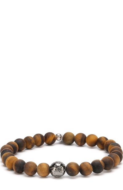 Браслет с эластичным основанием одинаково хорошо будет смотреться как с кожаной курткой и джинсами, так и с шортами и футболкой. Для изготовления аксессуара, напоминающего четки, мастера марки вырезали бусины из минерала тигровый глаз. Украшение дополнено миниатюрным шармом с выгравированным логотипом бренда и более крупным шаром из серебра 925 пробы.