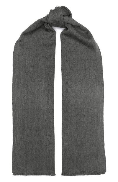 Мастера марки выполнили длинный серый шарф с рельефным GG-орнаментом из приятной на ощупь кашемировой пряжи. Изделие из такого материала прочнее и легче, чем из обычной шерсти. Края украсили короткой густой бахромой.