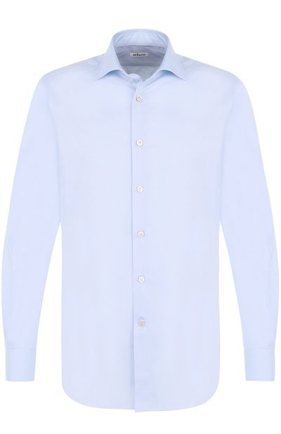 Голубая полуприталенная сорочка вошла в классическую коллекцию. Мастера бренда использовали для пошива модели мягкий гладкий хлопок, который хорошо пропускает воздух. Изделие с воротником кент будет гармонично смотреться в комплекте с темно-синим костюмом.