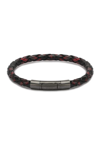 Для создания узкого плетеного браслета использовали зернистую матовую кожу базового черного цвета. За счет специальной технологии окрашивания на изделии получили уникальный красный мотив. Замок-защелку выполнили из стерлингового серебра с родиевым покрытием, поэтому он не потеряет блеск и не потемнеет со временем.