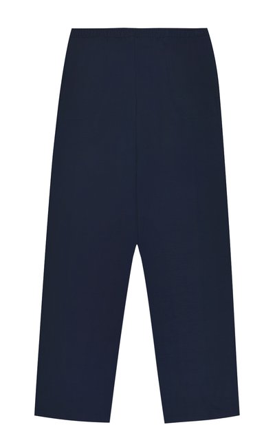 Мастера марки использовали для пошива прямых темно-синих брюк мягкий и прочный трикотаж на основе вискозы. Благодаря входящему в состав эластану и заниженному шаговому шву вещь не сковывает движений. Посадку на талии регулирует пояс со встроенной резинкой.