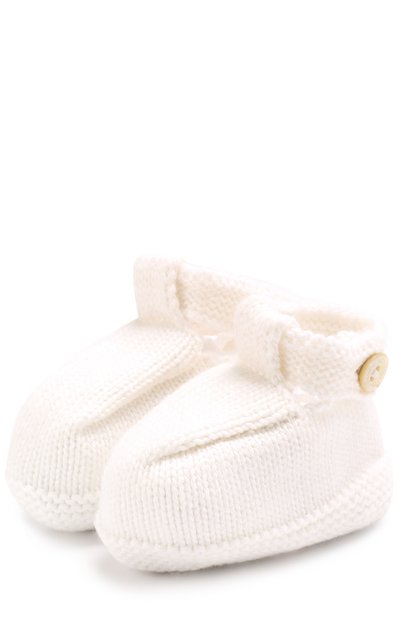 Мастера марки использовали для создания кремовых пинеток мягкую на основе прочного хлопка и нежного кашемира. Гипоаллергенный материал хорошо сохраняет тепло, поэтому в такой вещи будет комфортно. Благодаря застегивающемуся на пуговицу широкому ремешку модель не сползет с ноги.