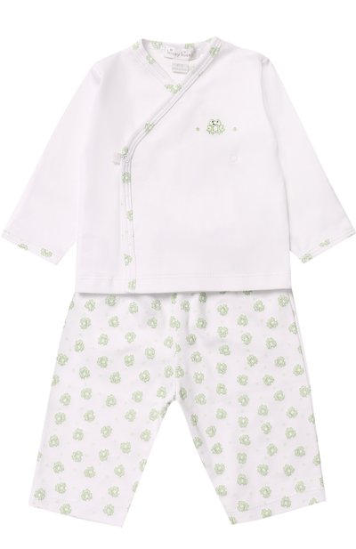 Для пошива распашонки мастера марки использовали приятное на ощупь хлопковое джерси, которое хорошо пропускает воздух. На длинных рукавах предусмотрены вставки, имитирующие варежки. На груди – небольшая вышивка в виде лягушки. В комплект вошли брюки с таким же принтом.