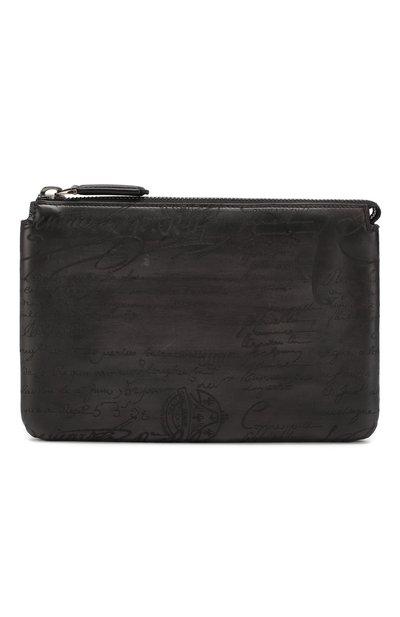 Графитовый клатч из осенне-зимней коллекции марки, основанной Алессандро Берлути, выполнен из прочной патинированной кожи Venezia с гравировкой в виде отрывков из переписки Людовика XV. Внутри — два отделения, карман на молнии и восемь слотов для пластиковых карт. Сзади — горизонтальная ручка.
