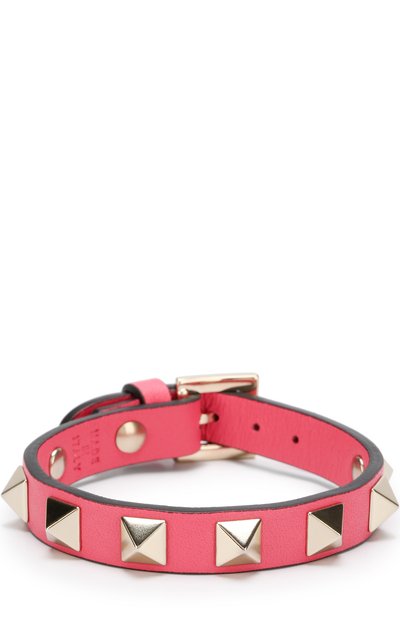 Для создания ярко-розового браслета мастера марки использовали узкий отрез прочной, но мягкой кожи. Модель украшена знаковыми для бренда шипами-пирамидами с платиновым напылением. Ширина регулируется ремешком с небольшой пряжкой.