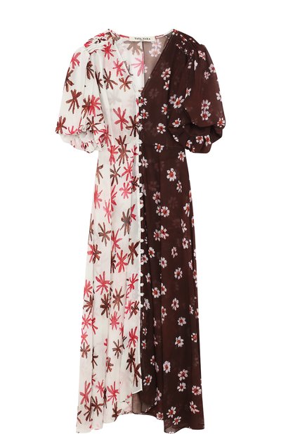 Платье из осенне-зимней коллекции мастера бренда сшили из приятного на ощупь полупрозрачного шелка. Коричнево-белая модель украшена цветочным принтом, как будто нарисованным от руки. Спереди — длинная застежка на круглые перламутровые пуговицы.